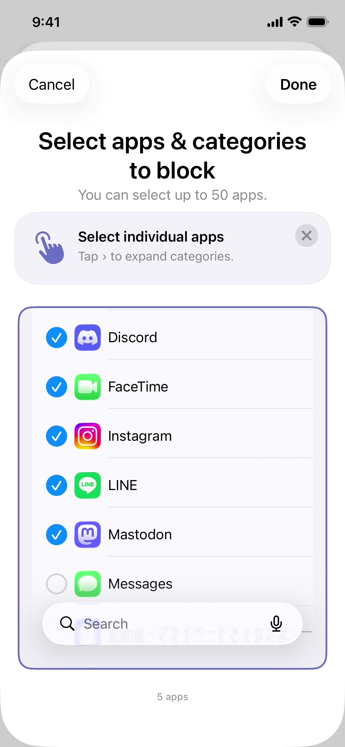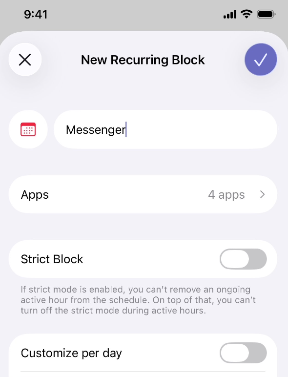 Give it a name like “Messenger” or “Good Morning”, choose the apps you want to block in the screen time picker, tap Done – and at the end tap “Checknote” sign.